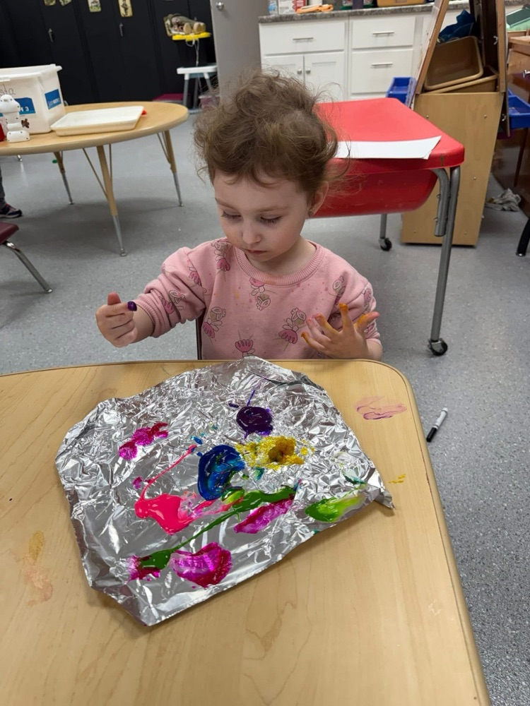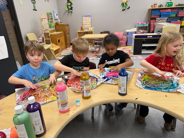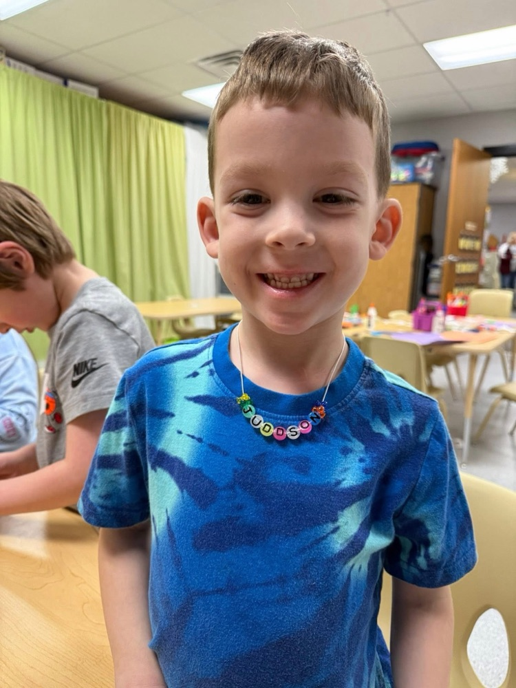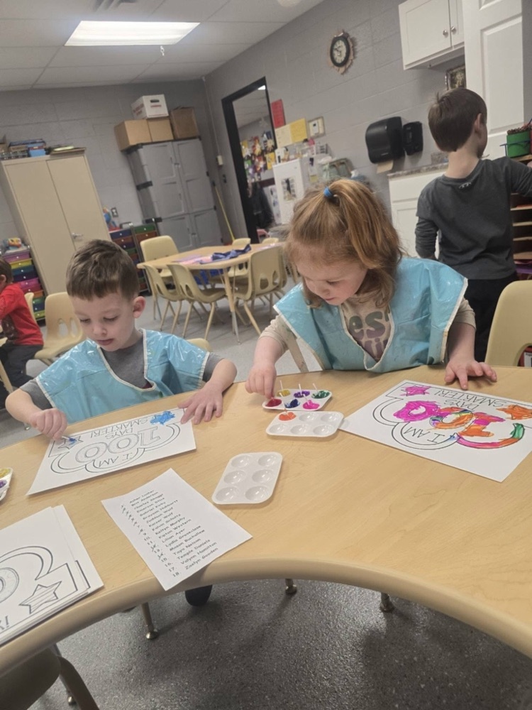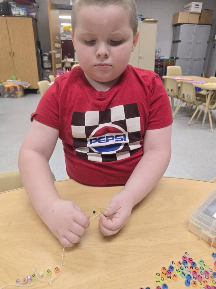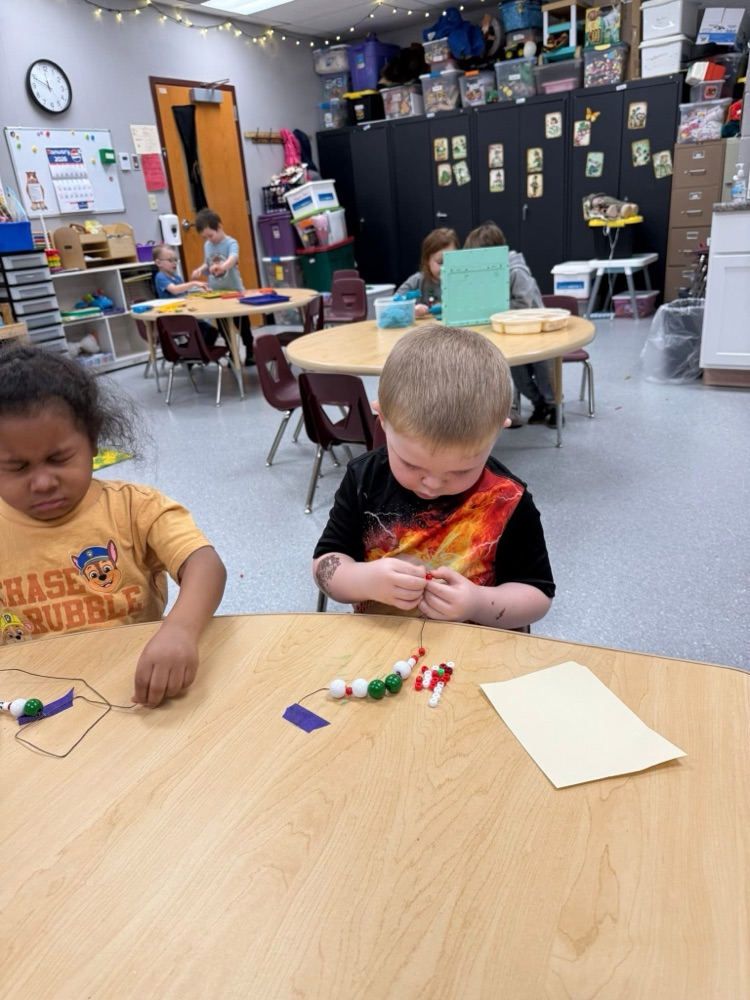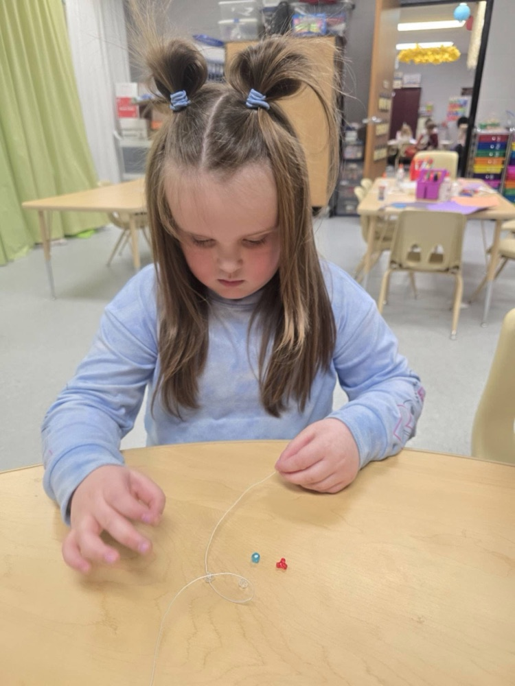 Preschoolers showing off their creativity and fine motor skills with necklace-making and painting!
