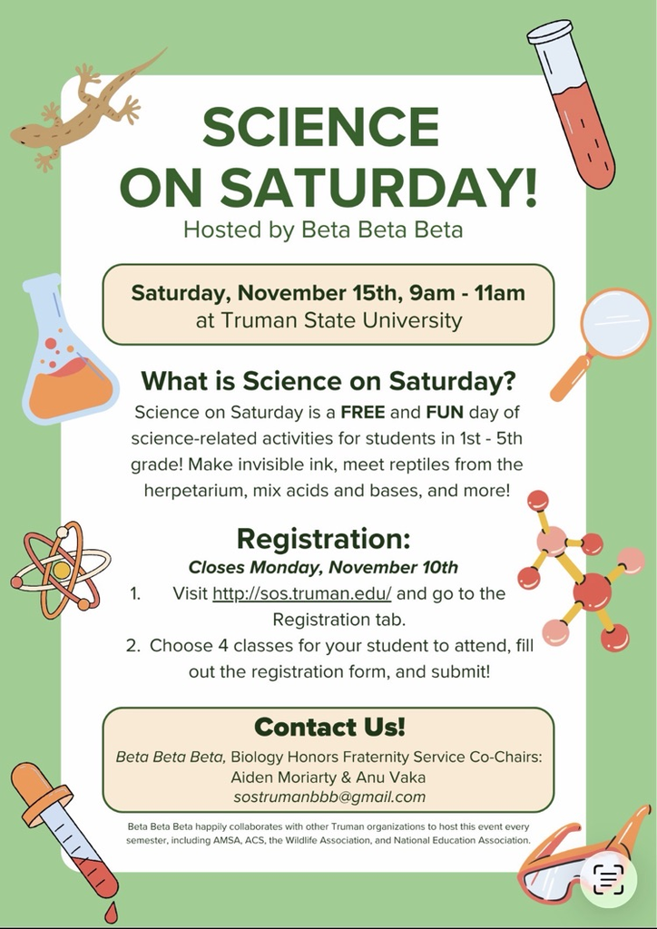 Opportunity for 1st-5th grade students next Saturday, November 15th. Register at https://sos.truman.edu/