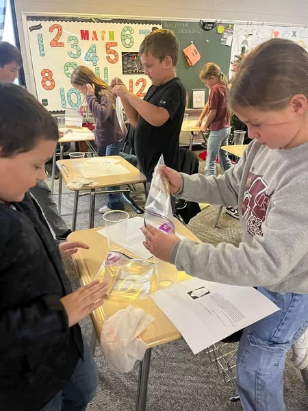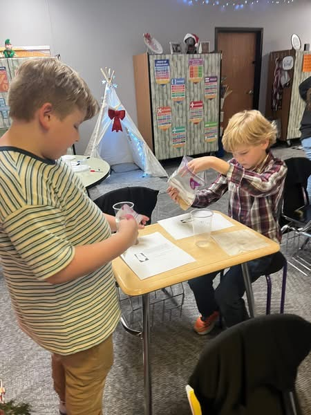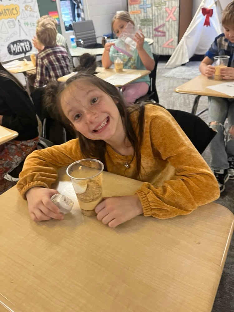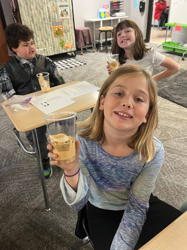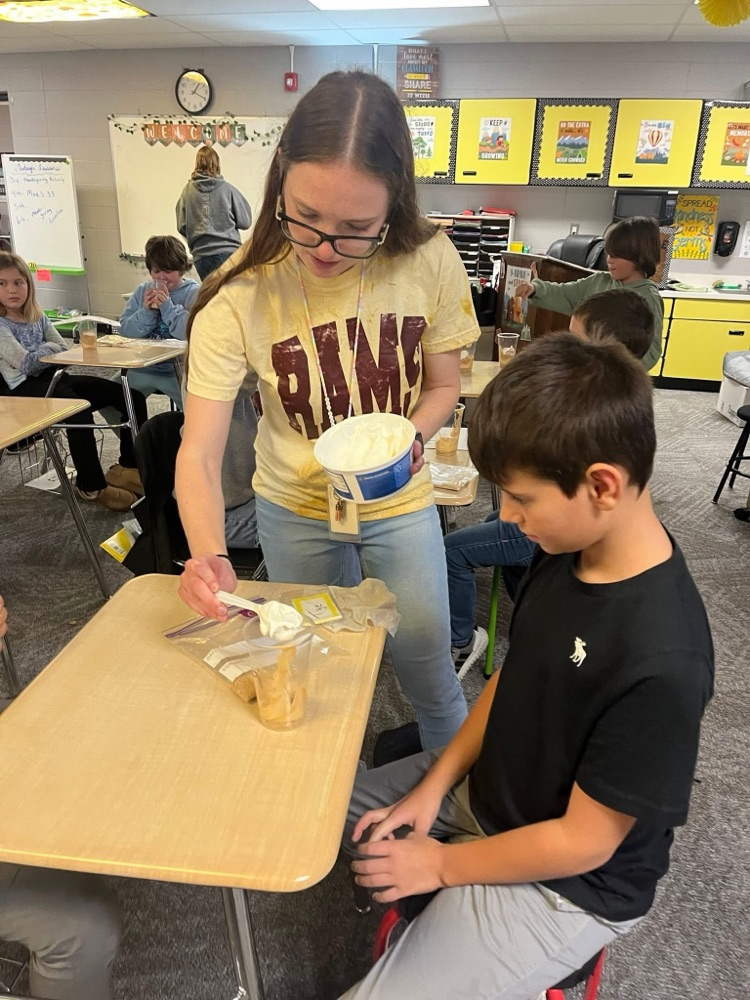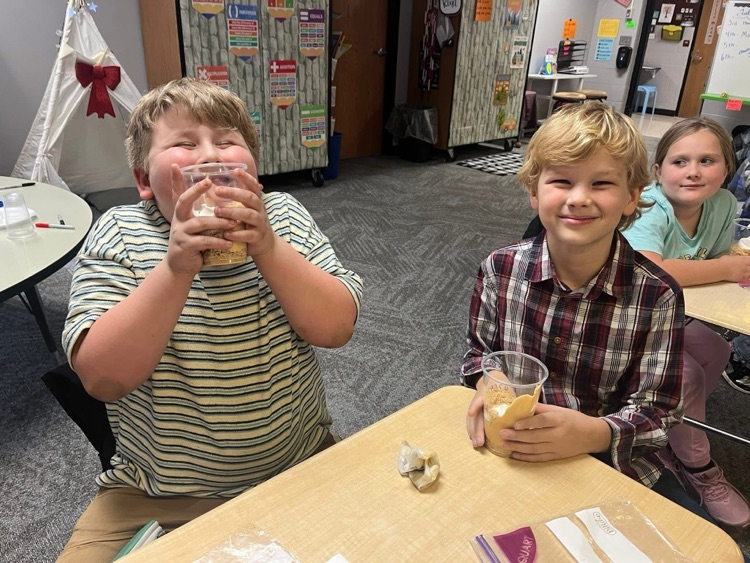 Yum! Third graders made “Pie in a Cup” today. As they worked through the recipe, they practiced their measuring, reading, and listening skills.
