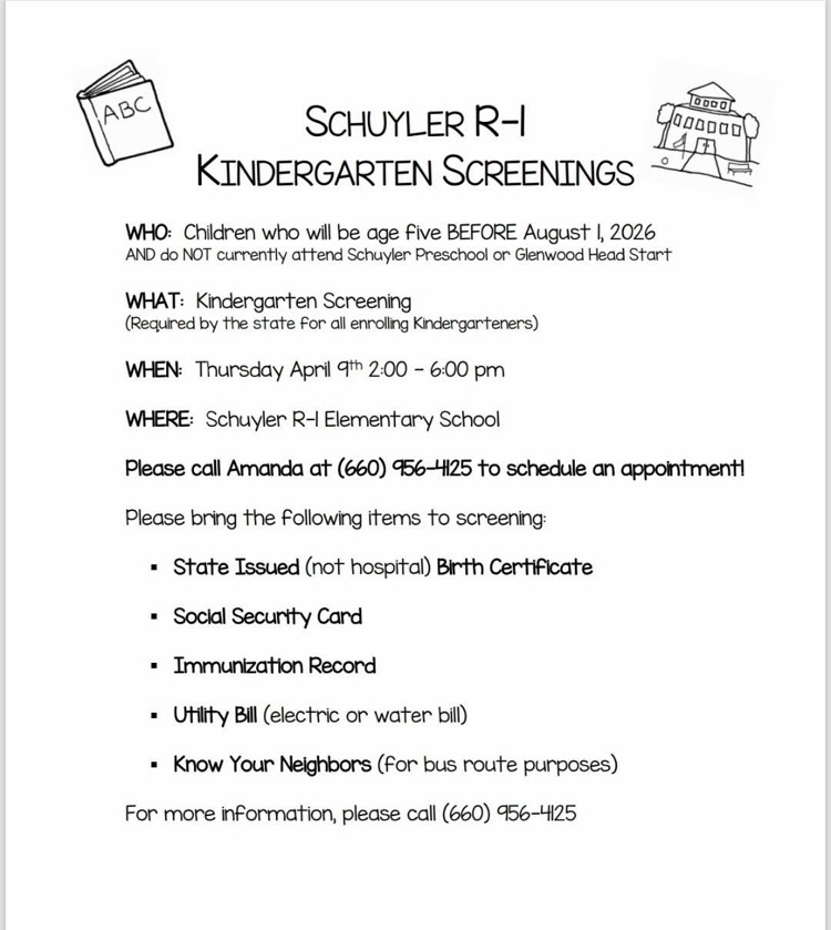 Call the elementary office to set up your child's kindergarten screening on April 9.
