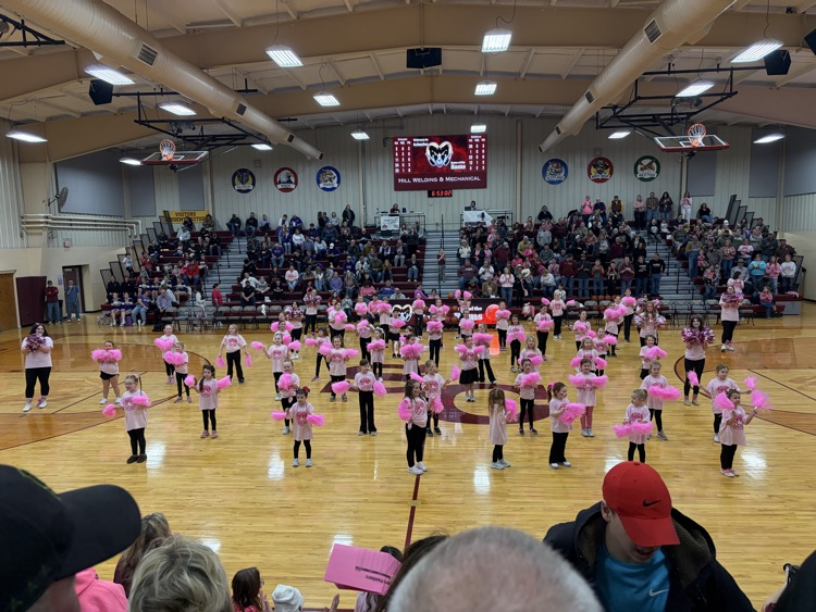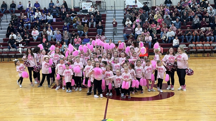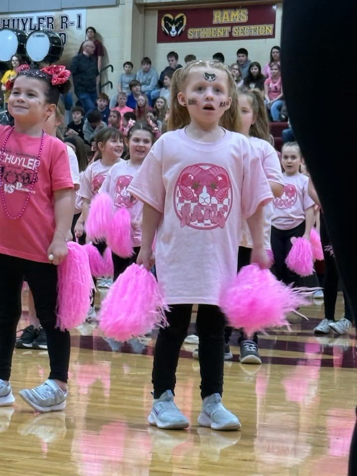 Coach Fischer, Coach Burns, and their cheer and dance teams organized a very pink and very cute Mini Rams camp and performance for Courtwarming!